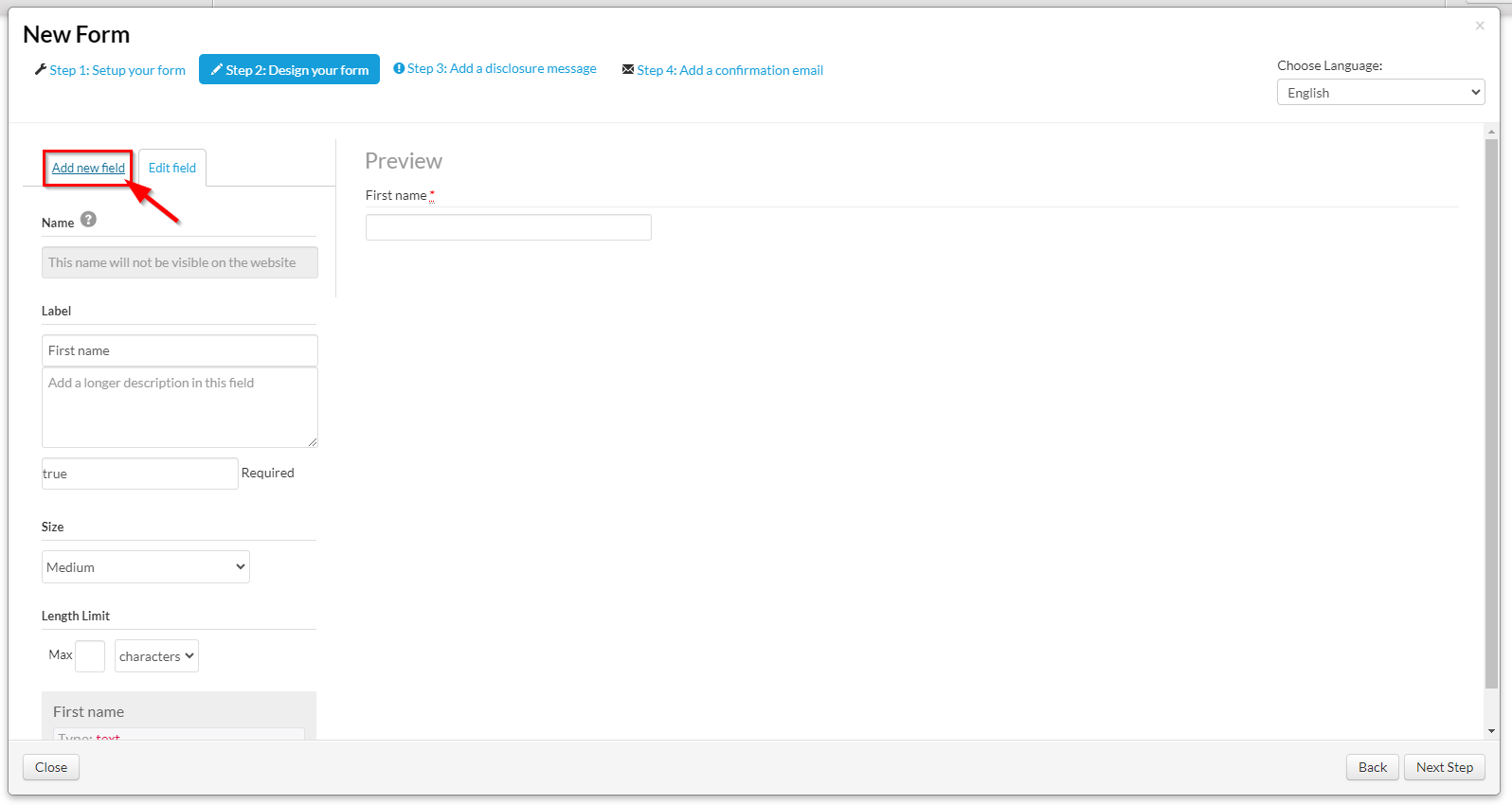 4. To return and add another field, select the Add New Field tab. Continue adding fields and configuring your form as needed.