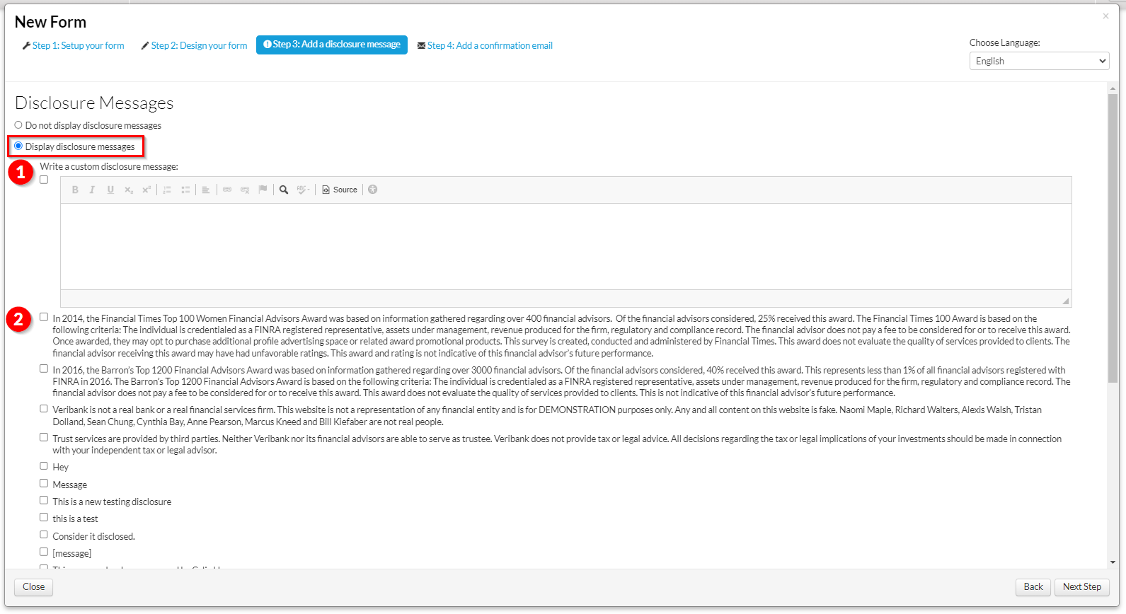 - Select an existing disclosure message: Click the check box beside the disclosure message that you wish to display.