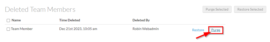 To completely remove a team member’s information, you can Purge their profile from the Deleted Team Members section. Purging a team member's profile will PERMANENTLY delete it from your website. It may NOT be recovered after it has been purged.