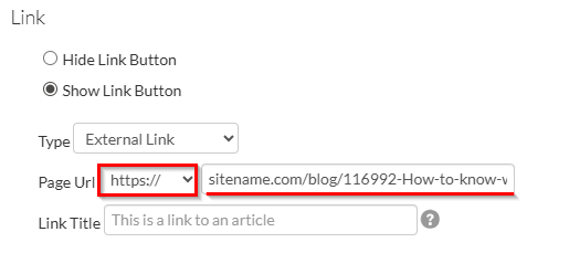 5. Copy and paste your link into the Link field. Make sure you remove the "http://" from your link URL and select "https://" in the drop-down menu.