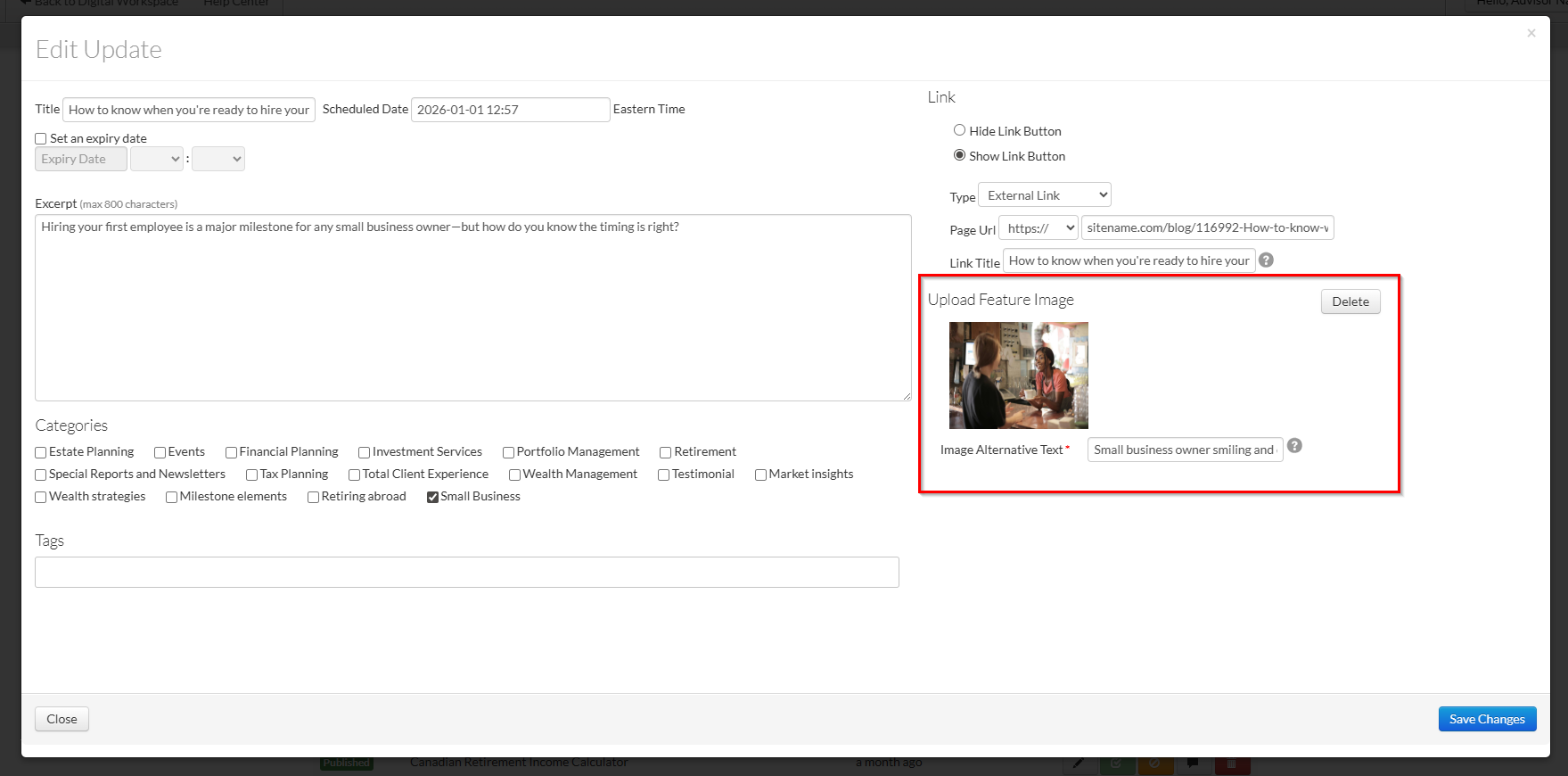 7. If you’re using Grid View, we recommend adding a Feature Image to make your update more visually engaging and eye-catching for viewers. Including an image helps your content stand out and encourages users to click through to read more.