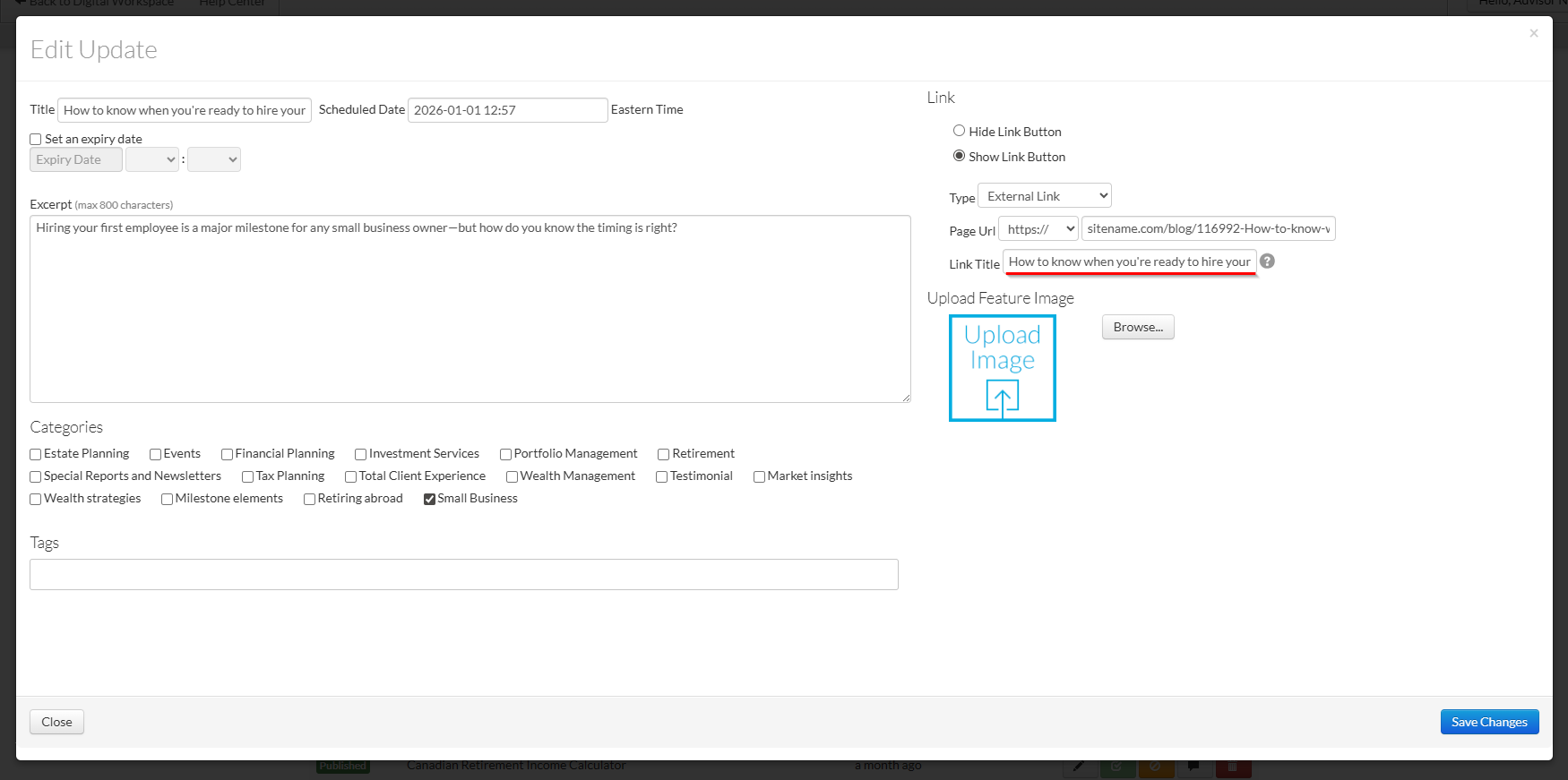 6. Add a Link Title (eg. "Read More", "Learn more about how we help business owners", or a similar call to action). The Link Title is what will be displayed to your audience instead of the page URL.