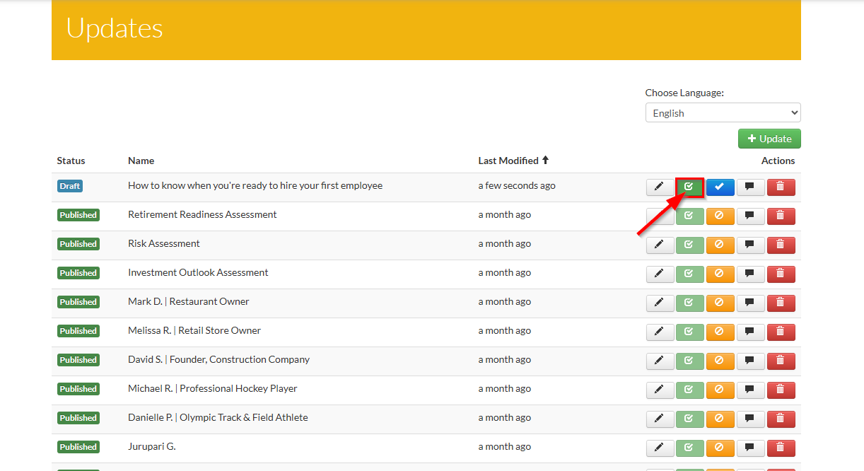 2. Click on +Update or of the update you want to edit to up the Updates Editor.