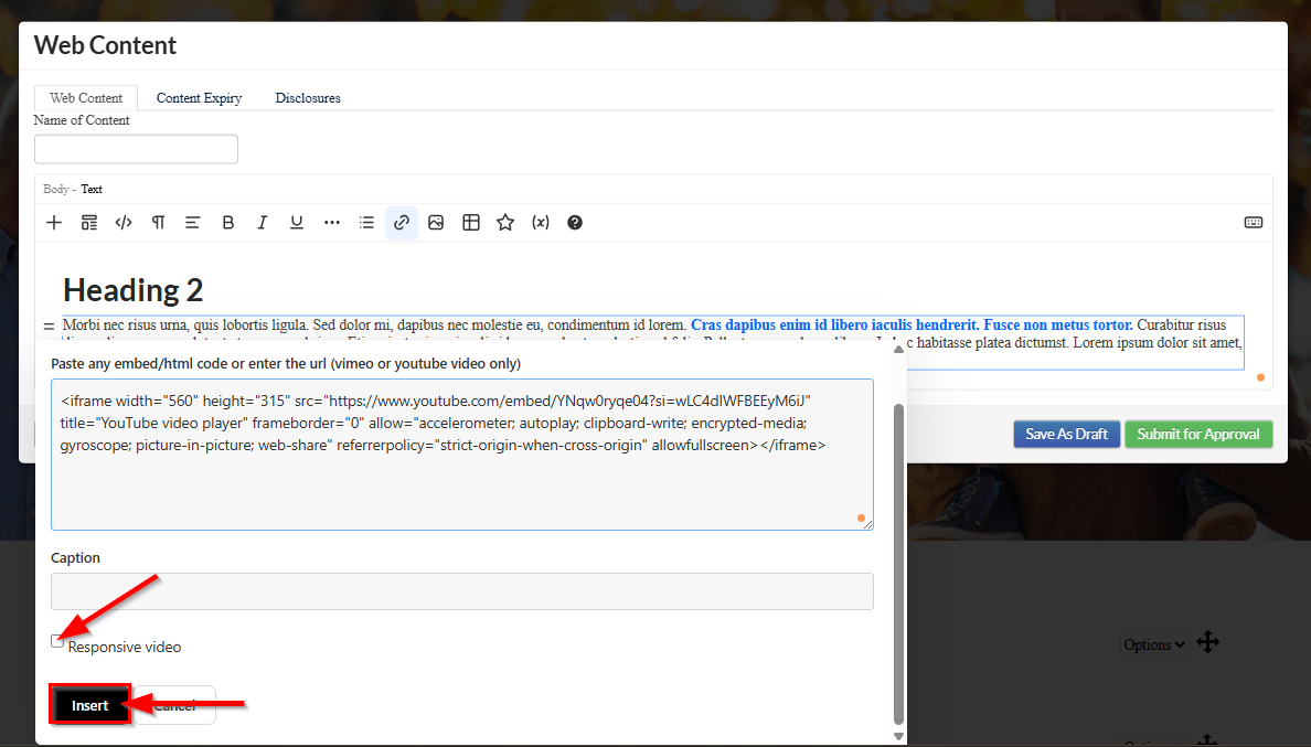 5. Paste your embed code into the field. You may add a caption to display beneath the video, if desired.