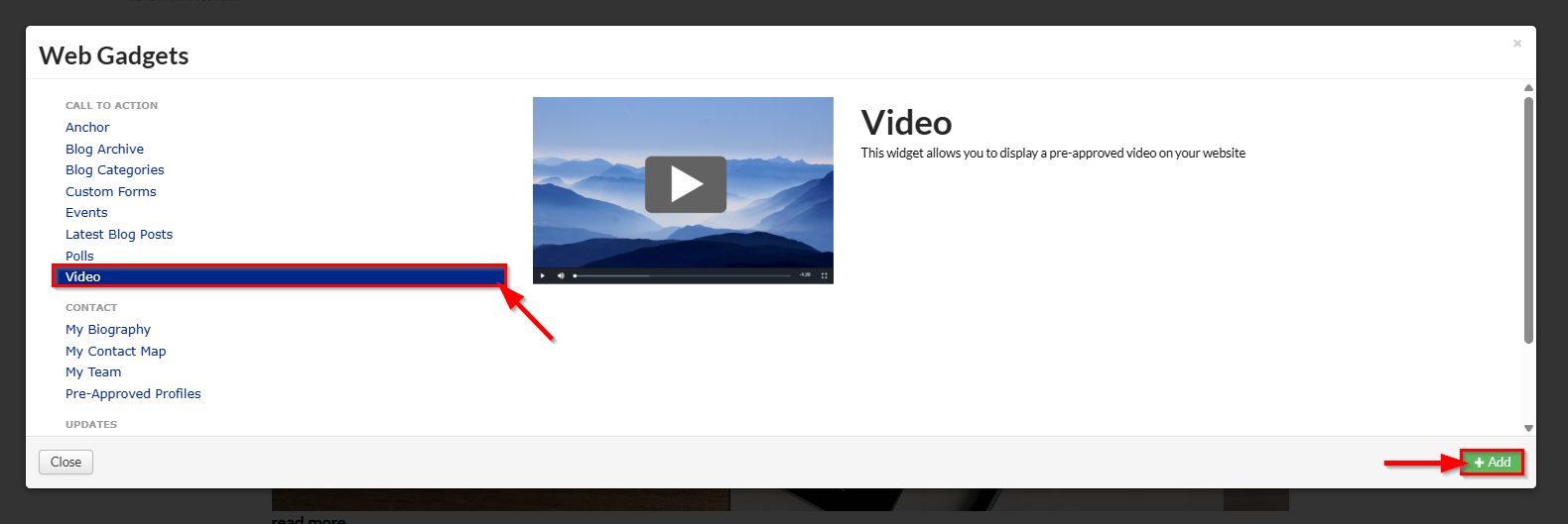 3. Locate and select the the Video widget in the list and click +Add to add it to your page, just below the banner.