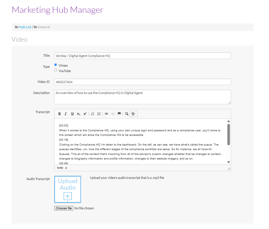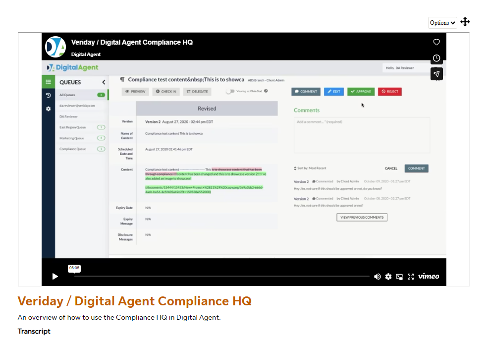 6. Your pre-approved video will now appear on the webpage. If an audio transcript was added, clicking Transcript will display the written version of the audio.