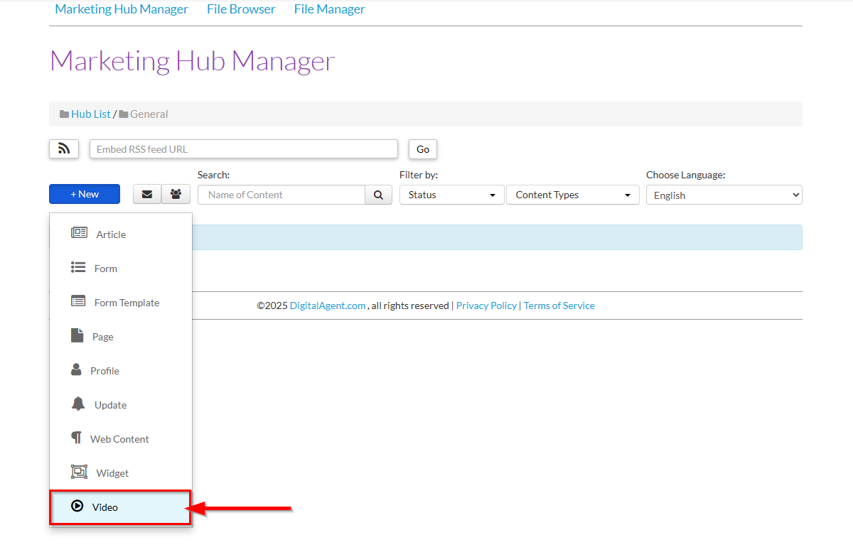 1. While inside of a Marketing Hub, click the +New button and select Video from the drop-down list.