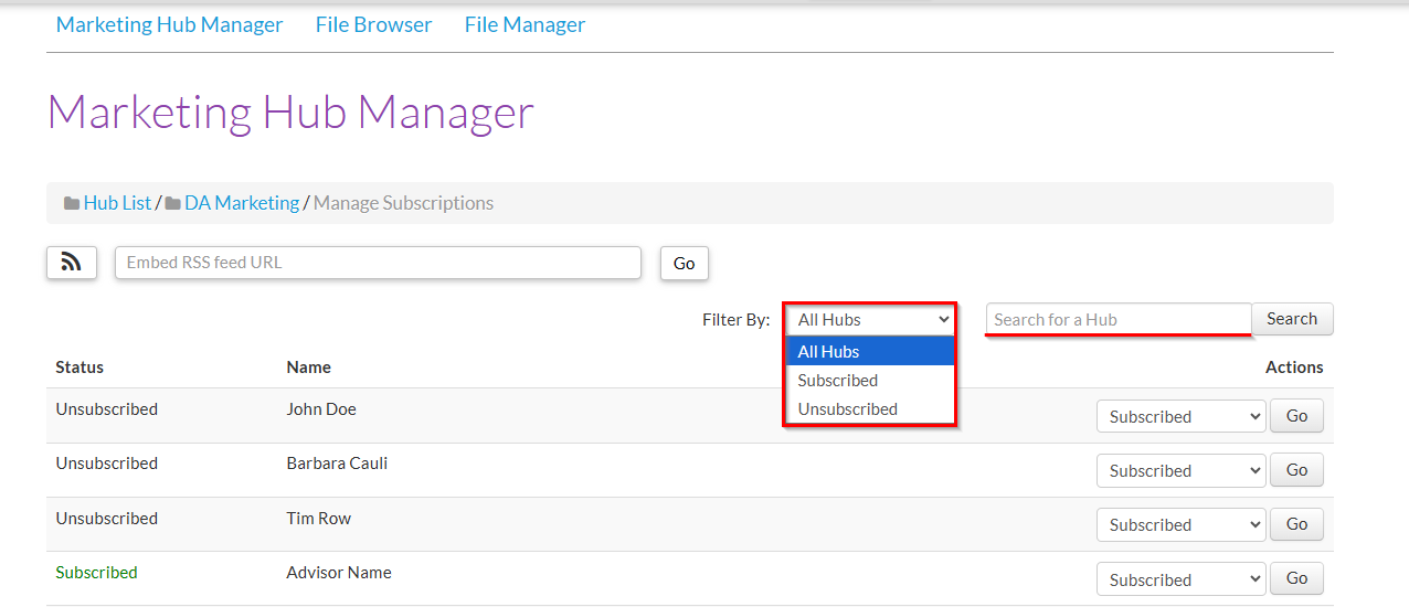 - Use the Filter drop-down to list only hubs that are currently Subscribed or Unsubscribed to the current Marketing Hub.