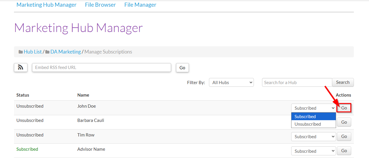 4. Choose Subscribed or Unsubscribed from the drop-down list, then click Go to apply the permission.