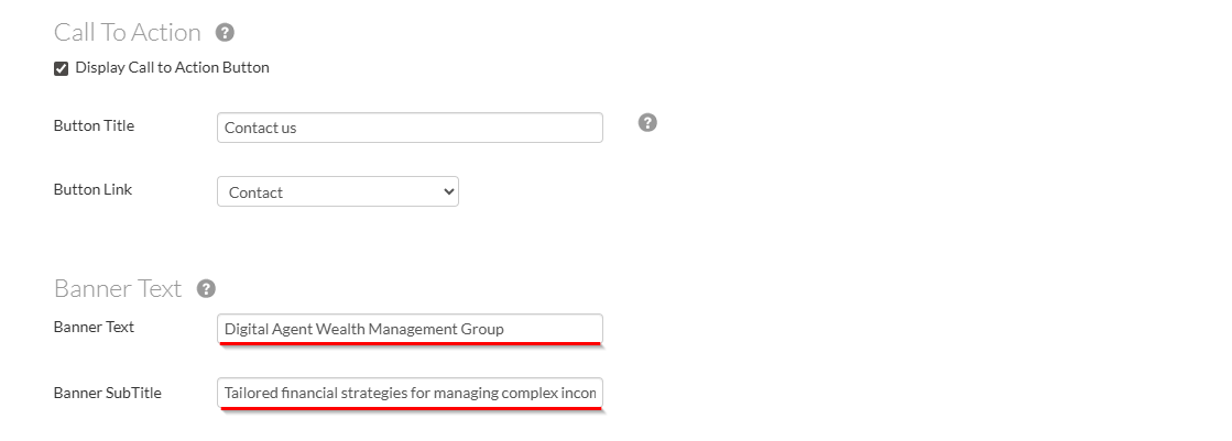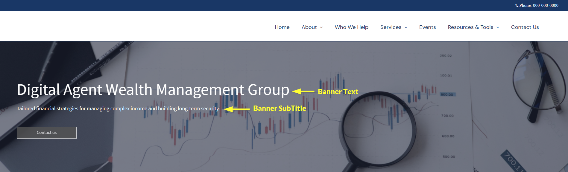 Important: Updating your Banner Text only applies to the Home page. All other pages automatically generate the banner text heading based off the Page Name.