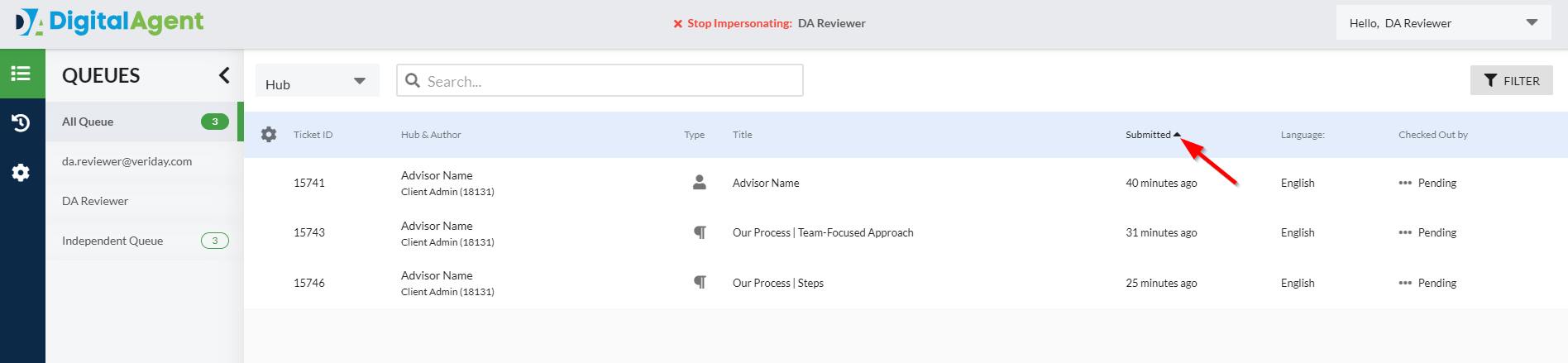The Submission Area is where all advisor's content submissions will display. Once advisor submits a piece of content for review, it's sent to the Compliance Queue their hub is associated with and will now be accessible to all reviewers assigned to that specific queue. Multiple reviewers may be assigned to the same queue.