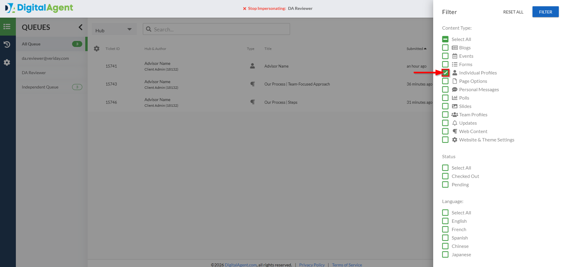 2. Choose any combination of Content Type, Status, or Language to display only submissions that meet your selected criteria.